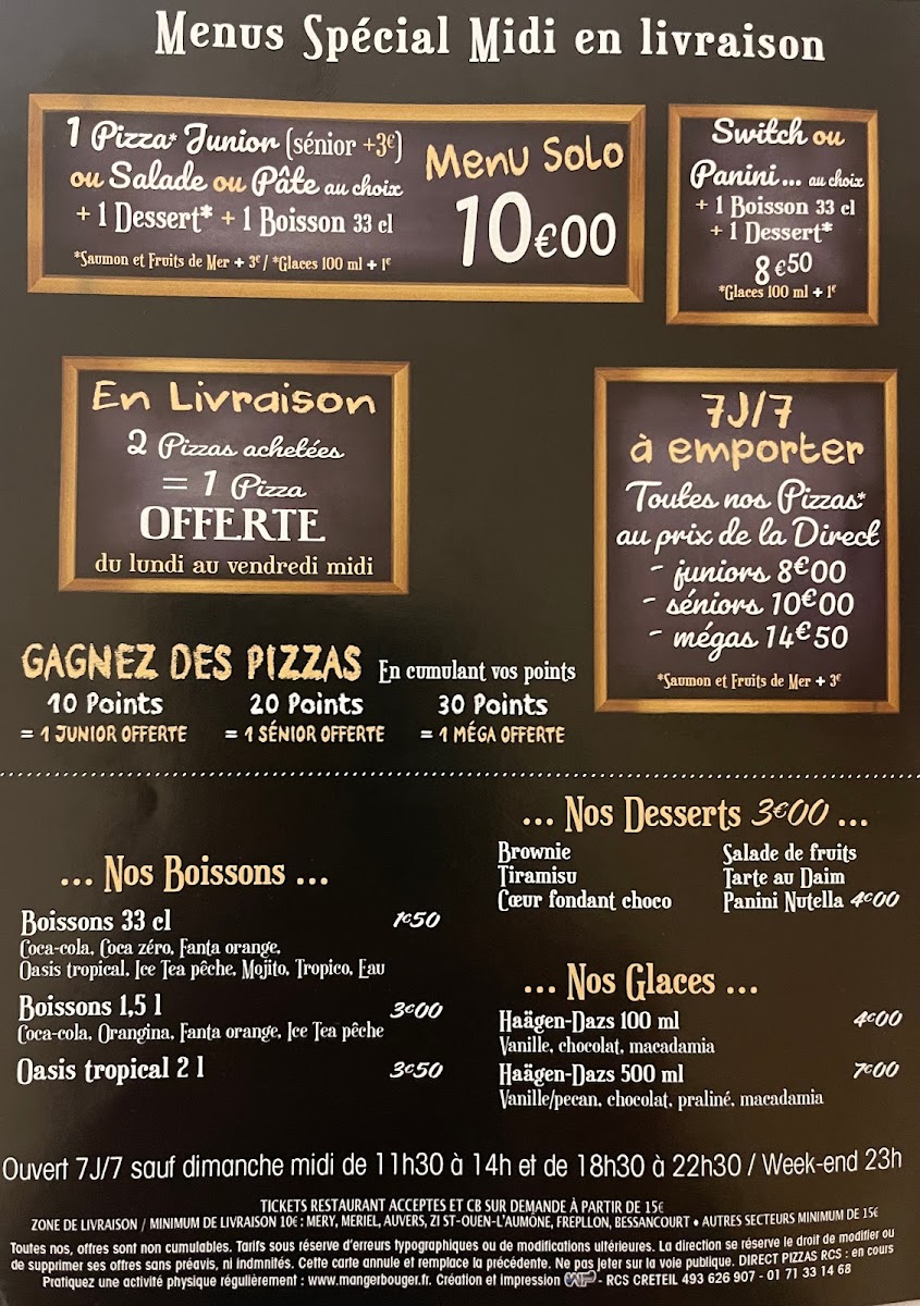 Welcome to Direct Pizza's, a culinary gem located at 18 Av. Marcel Perrin, Méry-sur-Oise, France. This renowned pizzeria has garnered rave reviews for its exceptional pizzas, offering a delightful variety of flavors that cater to all tastes. Customers praise the rich, crispy crust and fresh, generous toppings, ensuring a delicious bite every time.